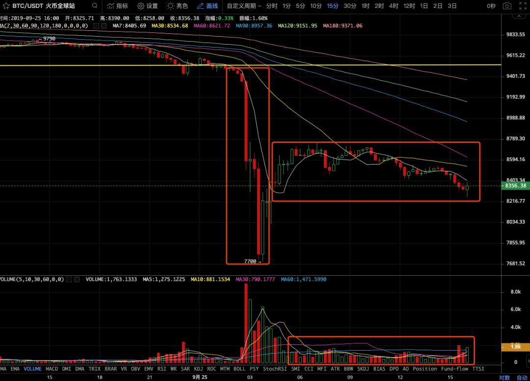 观察15分钟内的快速波动,比特币经历了两次较大幅度的下跌,其中第二次下跌已被有效遏制,这表明在8000美元以下区域,买入意愿较为强烈。